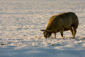 schaap zoekt gras in het sneeuw